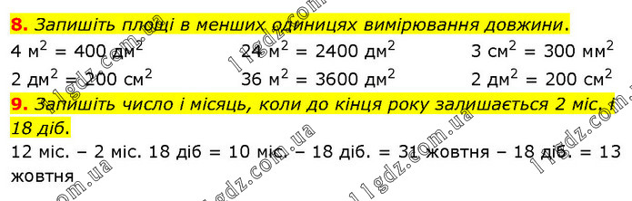 Запишіть площі в менших одиницях вимірювання довжини. 4 м2 = 400 дм2 2 дм2 = 200 см2 24 м2 = 2400 дм2 36 м2 = 3600 дм2 3 см2 = 300 мм2 2 дм2 = 200 см2 9. Запишіть число і місяць, коли до кінця року залишається 2 міс. і 18 діб. 12 міс. – 2 міс. 18 діб = 10 міс. – 18 діб. = 31 жовтня – 18 діб. = 13 жовтня
