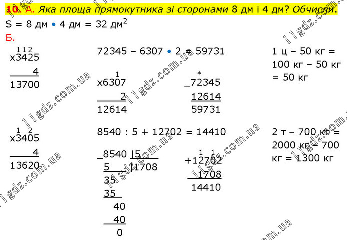 А. Яка площа прямокутника зі сторонами 8 дм і 4 дм? Обчисли. S = 8 дм • 4 дм = 32 дм2