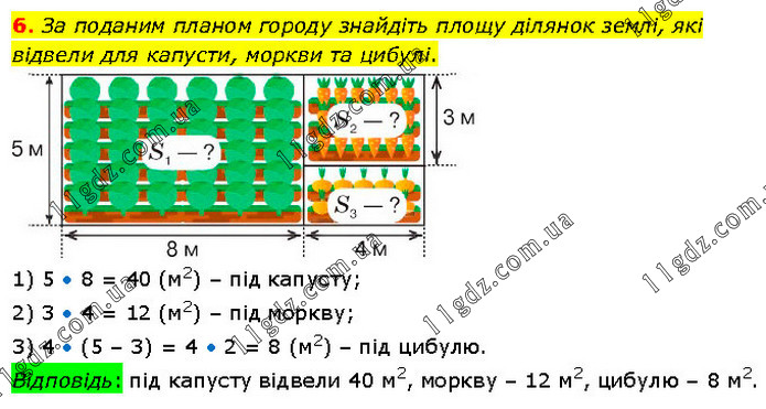 За поданим планом городу знайдіть площу ділянок землі, які відвели для капусти, моркви та цибулі. 1) 5 • 8 = 40 (м2) – під капусту; 2) 3 • 4 = 12 (м2) – під моркву; 3) 4 • (5 – 3) = 4 • 2 = 8 (м2) – під цибулю. Відповідь: під капусту відвели 40 м2, моркву – 12 м2, цибулю – 8 м2.