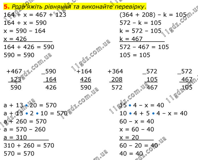 Розв'яжіть рівняння та виконайте перевірку. 164 + х = 467 + 123 164 + х = 590 х = 590 – 164 х = 426_______ 164 + 426 = 590 590 = 590 (364 + 208) – k = 105 572 – k = 105 k = 572 – 105 k = 467______ 572 – 467 = 105 105 = 105 а + 13 • 20 = 570 а + 13 • 2 • 10 = 570 а + 260 = 570 а = 570 – 260 а = 310______ 310 + 260 = 570 570 = 570 15 • 4 – х = 40 10 • 4 + 5 • 4 – х = 40 60 – х = 40 х = 60 – 40 х = 20____ 60 – 20 = 40 40 = 40
