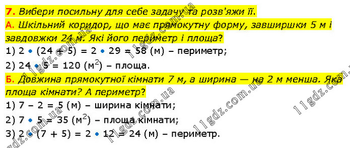 Вибери посильну для себе задачу та розв'яжи її. А. Шкільний коридор, що має прямокутну форму, завширшки 5 м і завдовжки 24 м. Які його периметр і площа? 1) 2 • (24 + 5) = 2 • 29 = 58 (м) – периметр; 2) 24 • 5 = 120 (м2) – площа. Б. Довжина прямокутної кімнати 7 м, а ширина — на 2 м менша. Яка площа кімнати? А периметр? 1) 7 – 2 = 5 (м) – ширина кімнати; 2) 7 • 5 = 35 (м2) – площа кімнати; 3) 2 • (7 + 5) = 2 • 12 = 24 (м) – периметр.