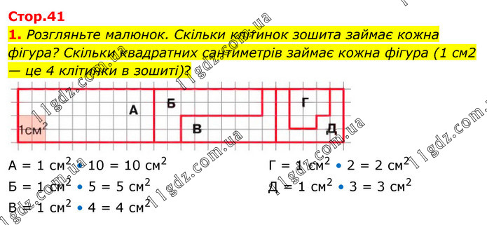 Розгляньте малюнок. Скільки клітинок зошита займає кожна фігура? Скільки квадратних сантиметрів займає кожна фігура (1 см2 — це 4 клітинки в зошиті)? А = 1 см2 • 10 = 10 см2 Б = 1 см2 • 5 = 5 см2 В = 1 см2 • 4 = 4 см2 Г = 1 см2 • 2 = 2 см2 Д = 1 см2 • 3 = 3 см2