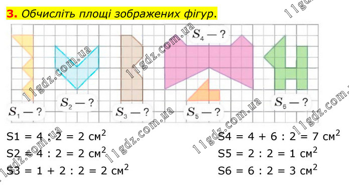 Обчисліть площі зображених фігур. S1 = 4 : 2 = 2 см2 S2 = 4 : 2 = 2 см2 S3 = 1 + 2 : 2 = 2 см2 S4 = 4 + 6 : 2 = 7 см2 S5 = 2 : 2 = 1 см2 S6 = 6 : 2 = 3 см2