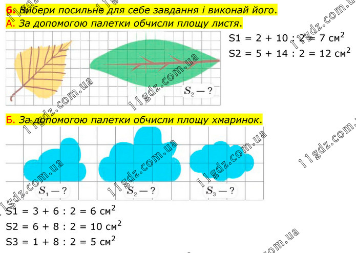 Вибери посильне для себе завдання і виконай його. А. За допомогою палетки обчисли площу листя. S1 = 2 + 10 : 2 = 7 см2 S2 = 5 + 14 : 2 = 12 см2 Б. За допомогою палетки обчисли площу хмаринок. S1 = 3 + 6 : 2 = 6 см2 S2 = 6 + 8 : 2 = 10 см2 S3 = 1 + 8 : 2 = 5 см2