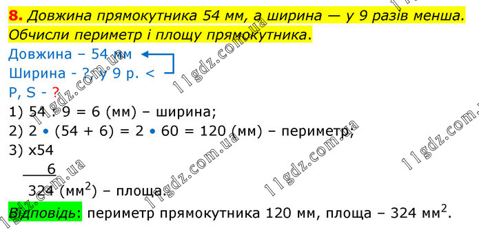 Довжина прямокутника 54 мм, а ширина — у 9 разів менша. Обчисли периметр і площу прямокутника. Довжина – 54 мм Ширина - ?, у 9 р. < P, S - ? 1) 54 : 9 = 6 (мм) – ширина; 2) 2 • (54 + 6) = 2 • 60 = 120 (мм) – периметр; Відповідь: периметр прямокутника 120 мм, площа – 324 мм2.
