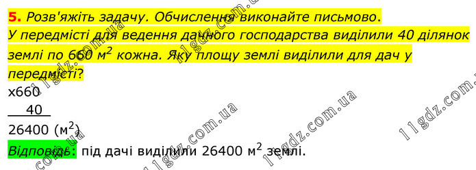Розв'яжіть задачу. Обчислення виконайте письмово. У передмісті для ведення дачного господарства виділили 40 ділянок землі по 660 м2 кожна. Яку площу землі виділили для дач у передмісті?
