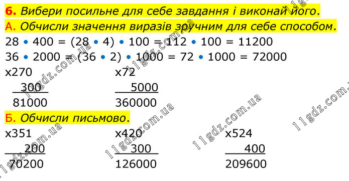 Вибери посильне для себе завдання і виконай його. А. Обчисли значення виразів зручним для себе способом. 28 • 400 = (28 • 4) • 100 = 112 • 100 = 11200 36 • 2000 = (36 • 2) • 1000 = 72 • 1000 = 72000