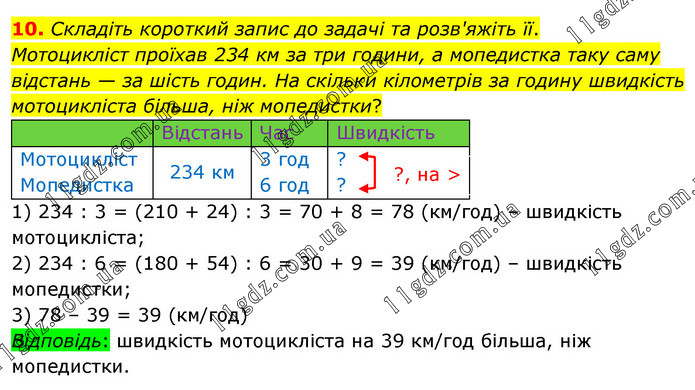 Складіть короткий запис до задачі та розв'яжіть її. Мотоцикліст проїхав 234 км за три години, а мопедистка таку саму відстань — за шість годин. На скільки кілометрів за годину швидкість мотоцикліста більша, ніж мопедистки? 1) 234 : 3 = (210 + 24) : 3 = 70 + 8 = 78 (км/год) – швидкість мотоцикліста; 2) 234 : 6 = (180 + 54) : 6 = 30 + 9 = 39 (км/год) – швидкість мопедистки; 3) 78 – 39 = 39 (км/год) Відповідь: швидкість мотоцикліста на 39 км/год більша, ніж мопедистки.