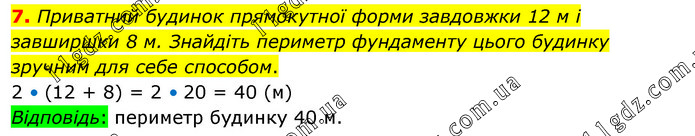 Приватний будинок прямокутної форми завдовжки 12 м і завширшки 8 м. Знайдіть периметр фундаменту цього будинку зручним для себе способом. 2 • (12 + 8) = 2 • 20 = 40 (м) Відповідь: периметр будинку 40 м.