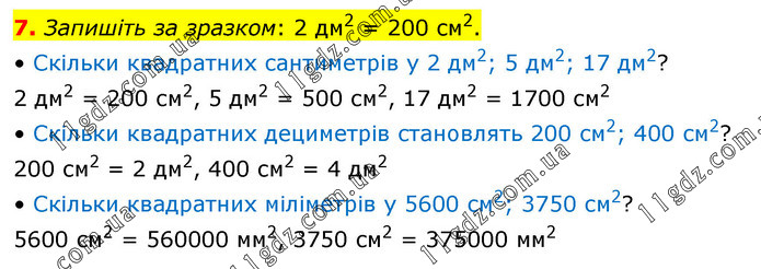 Запишіть за зразком: 2 дм2 = 200 см2. • Скільки квадратних сантиметрів у 2 дм2; 5 дм2; 17 дм2? 2 дм2 = 200 см2, 5 дм2 = 500 см2, 17 дм2 = 1700 см2 • Скільки квадратних дециметрів становлять 200 см2; 400 см2? 200 см2 = 2 дм2, 400 см2 = 4 дм2 • Скільки квадратних міліметрів у 5600 см2; 3750 см2? 5600 см2 = 560000 мм2, 3750 см2 = 375000 мм2