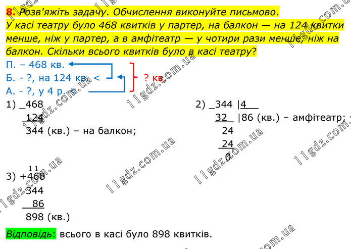 Розв'яжіть задачу. Обчислення виконуйте письмово. У касі театру було 468 квитків у партер, на балкон — на 124 квитки менше, ніж у партер, а в амфітеатр — у чотири рази менше, ніж на балкон. Скільки всього квитків було в касі театру?