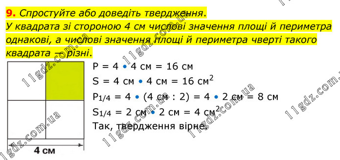 Спростуйте або доведіть твердження. У квадрата зі стороною 4 см числові значення площі й периметра однакові, а числові значення площі й периметра чверті такого квадрата — різні. Р = 4 • 4 см = 16 см S = 4 см • 4 см = 16 см2 Р1/4 = 4 • (4 см : 2) = 4 • 2 см = 8 см S1/4 = 2 см • 2 см = 4 см2 Так, твердження вірне.