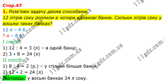 Розв'яжи задачу двома способами. 12 літрів соку розлили в чотири однакові банки. Скільки літрів соку у восьми таких банках? 12 л – 4 б. ? л – 8 б. І спосіб: 1) 12 : 4 = 3 (л) – в одній банці; 2) 3 • 8 = 24 (л) ІІ спосіб: 1) 8 : 4 = 2 (р.) – у стільки більше банок; 2) 12 • 2 = 24 (л) Відповідь: у восьмі банках 24 л соку.