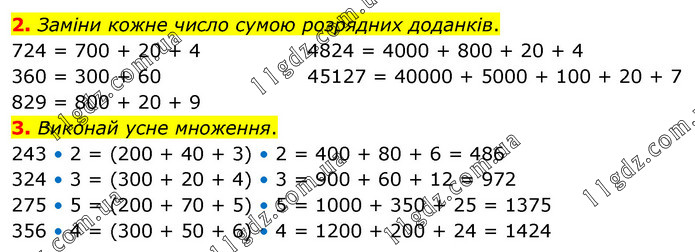 Заміни кожне число сумою розрядних доданків. 724 = 700 + 20 + 4 360 = 300 + 60 829 = 800 + 20 + 9 4824 = 4000 + 800 + 20 + 4 45127 = 40000 + 5000 + 100 + 20 + 7 3. Виконай усне множення. 243 • 2 = (200 + 40 + 3) • 2 = 400 + 80 + 6 = 486 324 • 3 = (300 + 20 + 4) • 3 = 900 + 60 + 12 = 972 275 • 5 = (200 + 70 + 5) • 5 = 1000 + 350 + 25 = 1375 356 • 4 = (300 + 50 + 6) • 4 = 1200 + 200 + 24 = 1424