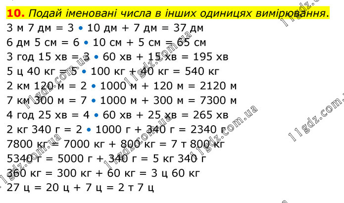 Подай іменовані числа в інших одиницях вимірювання. 3 м 7 дм = 3 • 10 дм + 7 дм = 37 дм 6 дм 5 см = 6 • 10 см + 5 см = 65 см 3 год 15 хв = 3 • 60 хв + 15 хв = 195 хв 5 ц 40 кг = 5 • 100 кг + 40 кг = 540 кг 2 км 120 м = 2 • 1000 м + 120 м = 2120 м 7 км 300 м = 7 • 1000 м + 300 м = 7300 м 4 год 25 хв = 4 • 60 хв + 25 хв = 265 хв 2 кг 340 г = 2 • 1000 г + 340 г = 2340 г 7800 кг = 7000 кг + 800 кг = 7 т 800 кг 5340 г = 5000 г + 340 г = 5 кг 340 г 360 кг = 300 кг + 60 кг = 3 ц 60 кг 27 ц = 20 ц + 7 ц = 2 т 7 ц