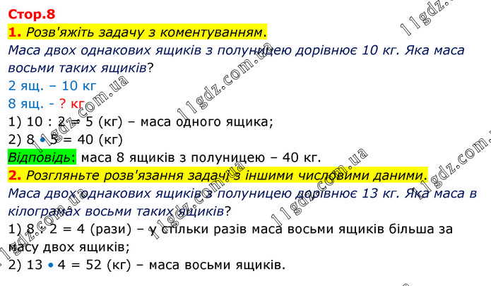 Розв'яжіть задачу з коментуванням. Маса двох однакових ящиків з полуницею дорівнює 10 кг. Яка маса восьми таких ящиків? 2 ящ. – 10 кг 8 ящ. - ? кг 1) 10 : 2 = 5 (кг) – маса одного ящика; 2) 8 • 5 = 40 (кг) Відповідь: маса 8 ящиків з полуницею – 40 кг. 2. Розгляньте розв'язання задачі з іншими числовими даними. Маса двох однакових ящиків з полуницею дорівнює 13 кг. Яка маса в кілограмах восьми таких ящиків? 1) 8 : 2 = 4 (рази) – у стільки разів маса восьми ящиків більша за масу двох ящиків; 2) 13 • 4 = 52 (кг) – маса восьми ящиків.