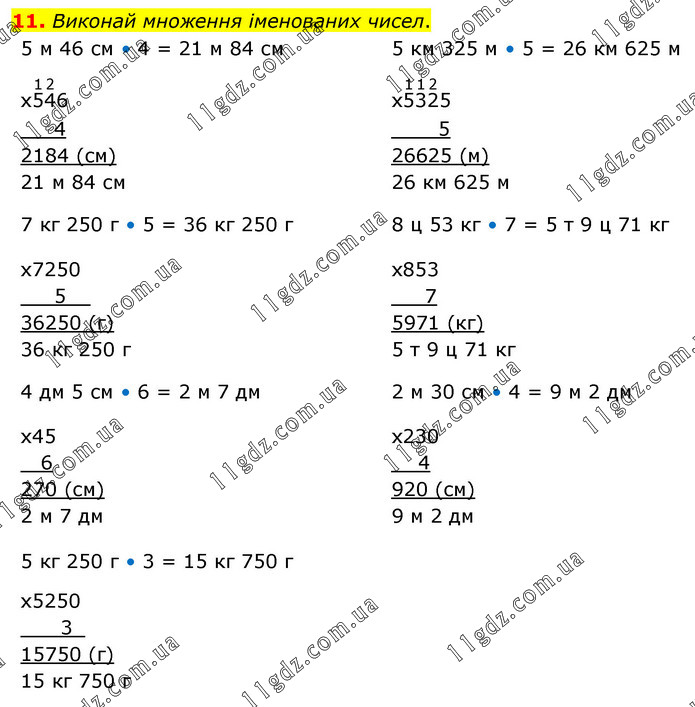 Виконай множення іменованих чисел. 5 м 46 см • 4 = 21 м 84 см, 5 км 325 м • 5 = 26 км 625 м, 7 кг 250 г • 5 = 36 кг 250 г, 8 ц 53 кг • 7 = 5 т 9 ц 71 кг, 4 дм 5 см • 6 = 2 м 7 дм ,2 м 30 см • 4 = 9 м 2 дм, 5 кг 250 г • 3 = 15 кг 750 г