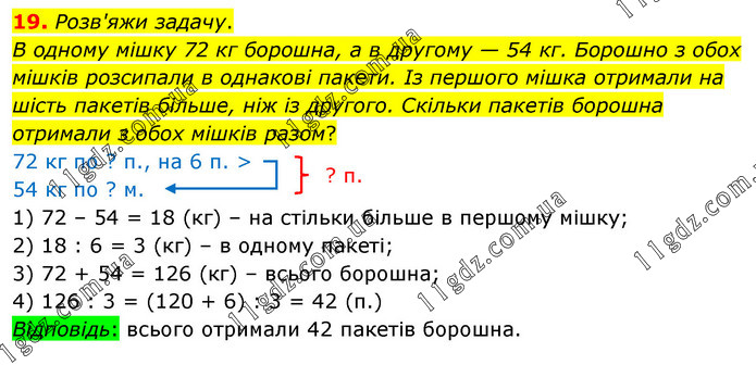 Розв'яжи задачу. В одному мішку 72 кг борошна, а в другому — 54 кг. Борошно з обох мішків розсипали в однакові пакети. Із першого мішка отримали на шість пакетів більше, ніж із другого. Скільки пакетів борошна отримали з обох мішків разом? 72 кг по ? п., на 6 п. > 54 кг по ? м. 1) 72 – 54 = 18 (кг) – на стільки більше в першому мішку; 2) 18 : 6 = 3 (кг) – в одному пакеті; 3) 72 + 54 = 126 (кг) – всього борошна; 4) 126 : 3 = (120 + 6) : 3 = 42 (п.) Відповідь: всього отримали 42 пакетів борошна.