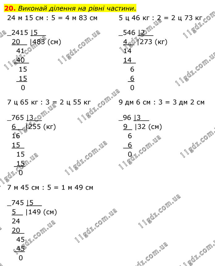 Виконай ділення на рівні частини. 24 м 15 см : 5 = 4 м 83 см, 5 ц 46 кг : 2 = 2 ц 73 кг 7 ц 65 кг : 3 = 2 ц 55 кг, 9 дм 6 см : 3 = 3 дм 2 см, 7 м 45 см : 5 = 1 м 49 см