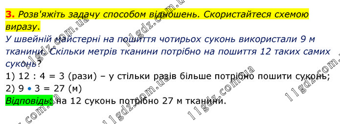 Розв'яжіть задачу способом відношень. Скористайтеся схемою виразу. У швейній майстерні на пошиття чотирьох суконь використали 9 м тканини. Скільки метрів тканини потрібно на пошиття 12 таких самих суконь? 1) 12 : 4 = 3 (рази) – у стільки разів більше потрібно пошити суконь; 2) 9 • 3 = 27 (м) Відповідь: на 12 суконь потрібно 27 м тканини.