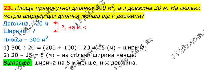 Площа прямокутної ділянки 300 м2, а її довжина 20 м. На скільки метрів ширина цієї ділянки менша від її довжини? Довжина – 20 м Ширина - ? Площа – 300 м2 1) 300 : 20 = (200 + 100) : 20 = 15 (м) – ширина; 2) 20 – 15 = 5 (м) – на стільки ширина менше. Відповідь: ширина на 5 м менше, ніж довжина.