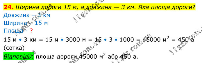 Ширина дороги 15 м, а довжина — 3 км. Яка площа дороги? Довжина – 3 км Ширина – 15 м Площа - ? 15 м • 3 км = 15 м • 3000 м = 15 • 3 • 1000 = 45000 м2 = 450 а (сотка) Відповідь: площа дороги 45000 м2 або 450 а