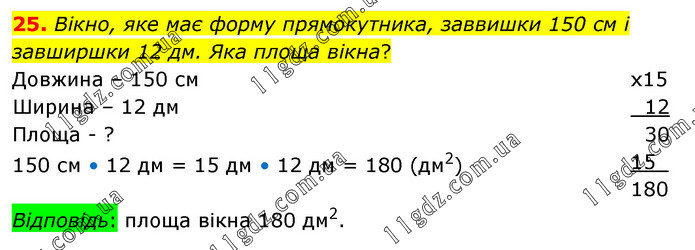 Вікно, яке має форму прямокутника, заввишки 150 см і завширшки 12 дм. Яка площа вікна? Довжина – 150 см Ширина – 12 дм Площа - ? 150 см • 12 дм = 15 дм • 12 дм = 180 (дм2)