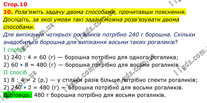 Розв'яжіть задачу двома способами, прочитавши пояснення. Дослідіть, за якої умови такі задачі можна розв'язувати двома способами. Для випікання чотирьох рогаликів потрібно 240 г борошна. Скільки знадобиться борошна для випікання восьми таких рогаликів? I спосіб 1) 240 : 4 = 60 (г) — борошна потрібно для одного рогалика; 2) 60 • 8 = 480 (г) — борошна потрібно для восьми рогаликів. II спосіб 1) 8 : 4 = 2 (р.) — у стільки разів більше потрібно спекти рогаликів; 2) 240 • 2 = 480 (г) — борошна потрібно для восьми рогаликів. Відповідь: 480 г борошна потрібно для восьми рогаликів.