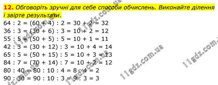 Обговоріть зручні для себе способи обчислень. Виконайте ділення і звірте результати. 64 : 2 = (60 + 4) : 2 = 30 + 2 = 32 36 : 3 = (30 + 6) : 3 = 10 + 2 = 12 55 : 5 = (50 + 5) : 5 = 10 + 1 = 11 42 : 3 = (30 + 12) : 3 = 10 + 4 = 14 65 : 5 = (50 + 15) : 5 = 10 + 3 = 13 84 : 7 = (70 + 14) : 7 = 10 + 2 = 12 80 : 40 = 80 : 10 : 4 = 8 : 4 = 2 90 : 30 = 90 : 10 : 3 = 9 : 3 = 3