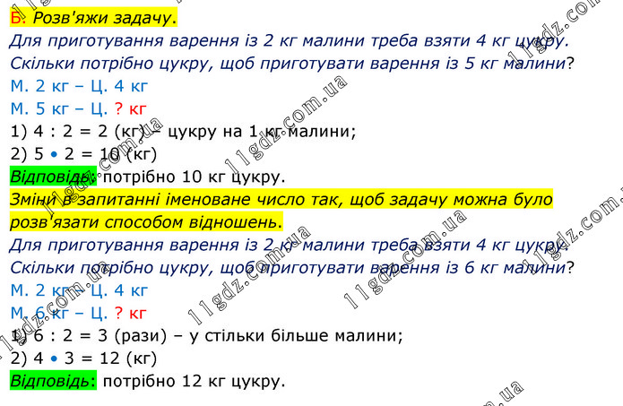 Розв'яжи задачу. Для приготування варення із 2 кг малини треба взяти 4 кг цукру. Скільки потрібно цукру, щоб приготувати варення із 5 кг малини? М. 2 кг – Ц. 4 кг М. 5 кг – Ц. ? кг 1) 4 : 2 = 2 (кг) – цукру на 1 кг малини; 2) 5 • 2 = 10 (кг) Відповідь: потрібно 10 кг цукру. Зміни в запитанні іменоване число так, щоб задачу можна було розв'язати способом відношень. Для приготування варення із 2 кг малини треба взяти 4 кг цукру. Скільки потрібно цукру, щоб приготувати варення із 6 кг малини? М. 2 кг – Ц. 4 кг М. 6 кг – Ц. ? кг 1) 6 : 2 = 3 (рази) – у стільки більше малини; 2) 4 • 3 = 12 (кг) Відповідь: потрібно 12 кг цукру.