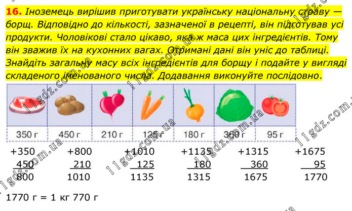 Іноземець вирішив приготувати українську національну страву — борщ. Відповідно до кількості, зазначеної в рецепті, він підготував усі продукти. Чоловікові стало цікаво, яка ж маса цих інгредієнтів. Тому він зважив їх на кухонних вагах. Отримані дані він уніс до таблиці. Знайдіть загальну масу всіх інгредієнтів для борщу і подайте у вигляді складеного іменованого числа. Додавання виконуйте послідовно. 1770 г = 1 кг 770 г