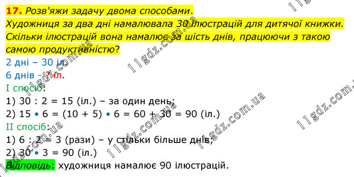 Розв'яжи задачу двома способами. Художниця за два дні намалювала 30 ілюстрацій для дитячої книжки. Скільки ілюстрацій вона намалює за шість днів, працюючи з такою самою продуктивністю? 2 дні – 30 іл. 6 днів - ? іл. І спосіб: 1) 30 : 2 = 15 (іл.) – за один день; 2) 15 • 6 = (10 + 5) • 6 = 60 + 30 = 90 (іл.) ІІ спосіб: 1) 6 : 2 = 3 (рази) – у стільки більше днів; 2) 30 • 3 = 90 (іл.) Відповідь: художниця намалює 90 ілюстрацій.