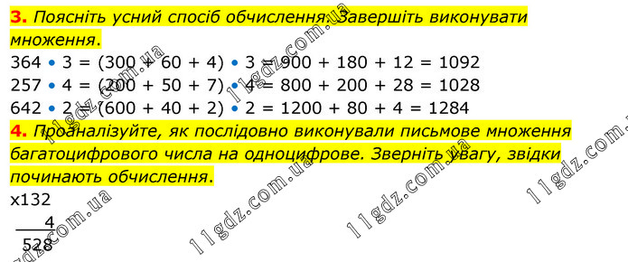 Поясніть усний спосіб обчислення. Завершіть виконувати множення. 364 • 3 = (300 + 60 + 4) • 3 = 900 + 180 + 12 = 1092 257 • 4 = (200 + 50 + 7) • 4 = 800 + 200 + 28 = 1028 642 • 2 = (600 + 40 + 2) • 2 = 1200 + 80 + 4 = 1284 4. Проаналізуйте, як послідовно виконували письмове множення багатоцифрового числа на одноцифрове. Зверніть увагу, звідки починають обчислення.