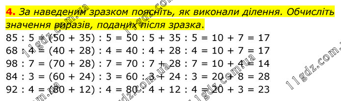 За наведеним зразком поясніть, як виконали ділення. Обчисліть значення виразів, поданих після зразка. 85 : 5 = (50 + 35) : 5 = 50 : 5 + 35 : 5 = 10 + 7 = 17 68 : 4 = (40 + 28) : 4 = 40 : 4 + 28 : 4 = 10 + 7 = 17 98 : 7 = (70 + 28) : 7 = 70 : 7 + 28 : 7 = 10 + 4 = 14 84 : 3 = (60 + 24) : 3 = 60 : 3 + 24 : 3 = 20 + 8 = 28 92 : 4 = (80 + 12) : 4 = 80 : 4 + 12 : 4 = 20 + 3 = 23