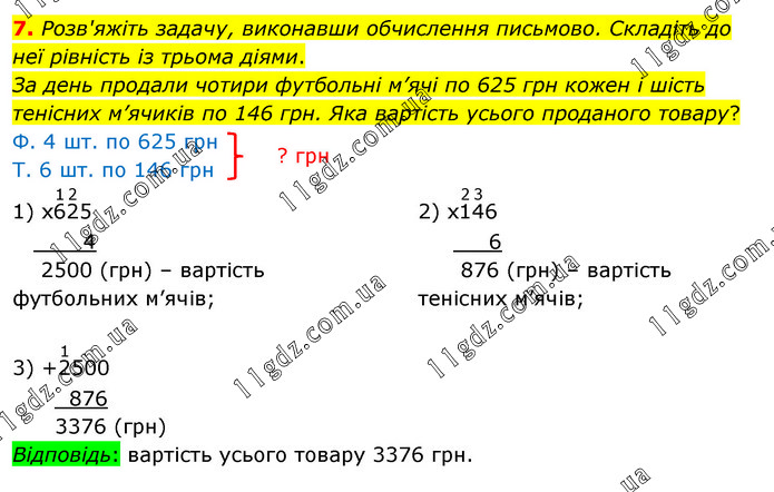 Розв'яжіть задачу, виконавши обчислення письмово. Складіть до неї рівність із трьома діями. За день продали чотири футбольні м’ячі по 625 грн кожен і шість тенісних м’ячиків по 146 грн. Яка вартість усього проданого товару? Відповідь: вартість усього товару 3376 грн.