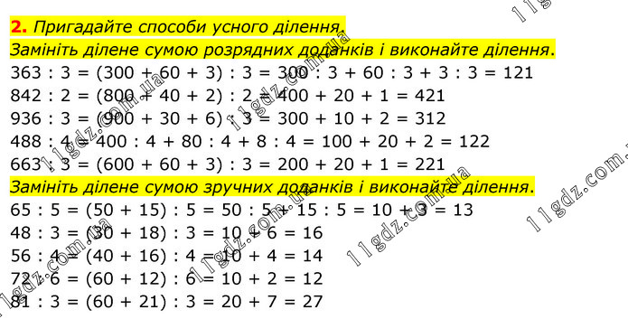 Пригадайте способи усного ділення. Замініть ділене сумою розрядних доданків і виконайте ділення. 363 : 3 = (300 + 60 + 3) : 3 = 300 : 3 + 60 : 3 + 3 : 3 = 121 842 : 2 = (800 + 40 + 2) : 2 = 400 + 20 + 1 = 421 936 : 3 = (900 + 30 + 6) : 3 = 300 + 10 + 2 = 312 488 : 4 = 400 : 4 + 80 : 4 + 8 : 4 = 100 + 20 + 2 = 122 663 : 3 = (600 + 60 + 3) : 3 = 200 + 20 + 1 = 221 Замініть ділене сумою зручних доданків і виконайте ділення. 65 : 5 = (50 + 15) : 5 = 50 : 5 + 15 : 5 = 10 + 3 = 13 48 : 3 = (30 + 18) : 3 = 10 + 6 = 16 56 : 4 = (40 + 16) : 4 = 10 + 4 = 14 72 : 6 = (60 + 12) : 6 = 10 + 2 = 12 81 : 3 = (60 + 21) : 3 = 20 + 7 = 27