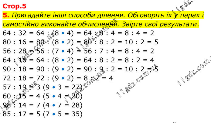 Пригадайте інші способи ділення. Обговоріть їх у парах і самостійно виконайте обчислення. Звірте свої результати. 64 : 32 = 64 : (8 • 4) = 64 : 8 : 4 = 8 : 4 = 2 80 : 16 = 80 : (8 • 2) = 80 : 8 : 2 = 10 : 2 = 5 56 : 28 = 56 : (7 • 4) = 56 : 7 : 4 = 8 : 4 = 2 64 : 16 = 64 : (8 • 2) = 64 : 8 : 2 = 8 : 2 = 4 90 : 18 = 90 : (9 • 2) = 90 : 9 : 2 = 10 : 2 = 5 72 : 18 = 72 : (9 • 2) = 8 : 2 = 4 57 : 19 = 3 (9 • 3 = 27) 60 : 15 = 4 (5 • 4 = 20) 98 : 14 = 7 (4 • 7 = 28) 85 : 17 = 5 (7 • 5 = 35)