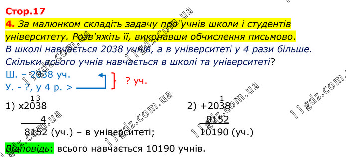 За малюнком складіть задачу про учнів школи і студентів університету. Розв'яжіть її, виконавши обчислення письмово. В школі навчається 2038 учнів, а в університеті у 4 рази більше. Скільки всього учнів навчається в школі та університеті? Відповідь: всього навчається 10190 учнів.