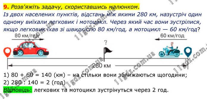 Розв'яжіть задачу, скориставшись малюнком. Із двох населених пунктів, відстань між якими 280 км, назустріч один одному виїхали легковик і мотоцикл. Через який час вони зустрілися, якщо легковик їхав зі швидкістю 80 км/год, а мотоцикл — 60 км/год? 1) 80 + 60 = 140 (км) – на стільки вони зближаються щогодини; 2) 280 : 140 = 2 (год) Відповідь: легкових та мотоцикл зустрінуться через 2 год.