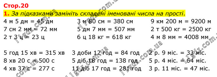 За підказками замініть складені іменовані числа на прості. 4 м 5 дм = 45 дм 7 см 2 мм = 72 мм 2 т 3 ц = 23 ц 3 м 80 см = 380 см 5 дм 7 мм = 507 мм 6 ц 18 кг = 618 кг 9 км 200 м = 9200 м 2 т 500 кг = 2500 кг 4 м 8 мм = 4008 мм 5 год 15 хв = 315 хв 8 хв 20 с = 500 с 4 хв 37 с = 277 с 3 доби 12 год = 84 год 5 діб 18 год = 138 год 11 діб 17 год = 281 год 2 р. 9 міс. = 33 міс. 5 р. 4 міс. = 64 міс. 3 р. 11 міс. = 47 міс.