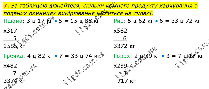 За таблицею дізнайтеся, скільки кожного продукту харчування в поданих одиницях вимірювання міститься на складі. Пшоно: 3 ц 17 кг • 5 = 15 ц 85 кг Рис: 5 ц 62 кг • 6 = 33 ц 72 кг Гречка: 4 ц 82 кг • 7 = 33 ц 74 кг Горох: 2 ц 39 кг • 3 = 7 ц 17 кг