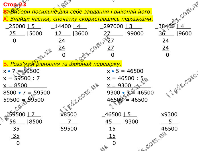 Розв'яжи рівняння та виконай перевірку. х • 7 = 59500 х = 59500 : 7 х = 8500______ 8500 • 7 = 59500 59500 = 59500 х • 5 = 46500 х = 46500 : 5 х = 9300______ 9300 • 5 = 46500 46500 = 46500