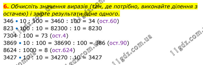 Обчисліть значення виразів (там, де потрібно, виконайте ділення з остачею) і звірте результати одне одного. 346 • 10 : 100 = 3460 : 100 = 34 (ост.60) 823 • 100 : 10 = 82300 : 10 = 8230 7304 : 100 = 73 (ост.4) 3869 • 10 : 100 = 38690 : 100 = 386 (ост.90) 8624 : 1000 = 8 (ост.624) 3427 • 10 : 10 = 34270 : 10 = 3427