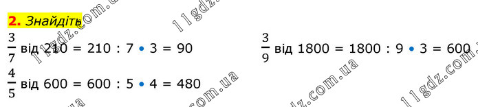 Знайдіть 3/7 від 210 = 210 : 7 • 3 = 90 4/5 від 600 = 600 : 5 • 4 = 480 3/9 від 1800 = 1800 : 9 • 3 = 600