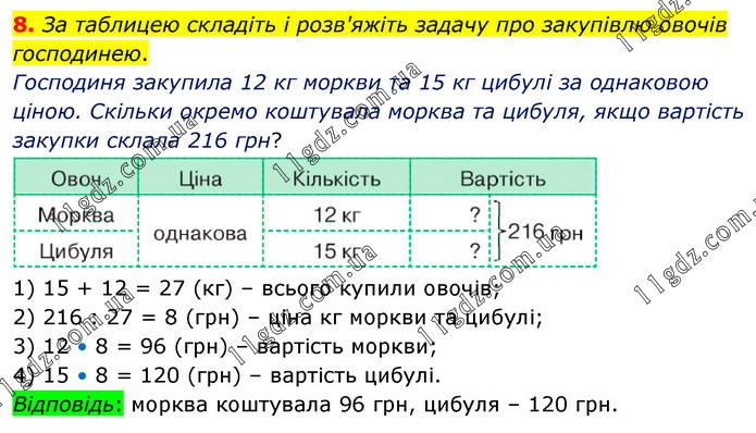 За таблицею складіть і розв'яжіть задачу про закупівлю овочів господинею. Господиня закупила 12 кг моркви та 15 кг цибулі за однаковою ціною. Скільки окремо коштувала морква та цибуля, якщо вартість закупки склала 216 грн? 1) 15 + 12 = 27 (кг) – всього купили овочів; 2) 216 : 27 = 8 (грн) – ціна кг моркви та цибулі; 3) 12 • 8 = 96 (грн) – вартість моркви; 4) 15 • 8 = 120 (грн) – вартість цибулі. Відповідь: морква коштувала 96 грн, цибуля – 120 грн.