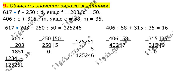 Обчисліть значення виразів зі змінними. 617 • f – 250 : d, якщо f = 203, d = 50. 406 : с + 315 : m, якщо с = 58, m = 35. 617 • 203 – 250 : 50 = 125246; 406 : 58 + 315 : 35 = 16
