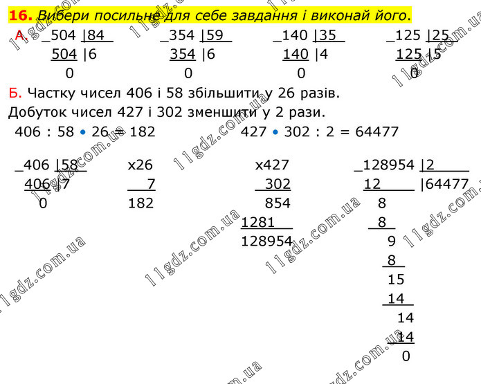 Б. Частку чисел 406 і 58 збільшити у 26 разів. Добуток чисел 427 і 302 зменшити у 2 рази. 406 : 58 • 26 = 182 427 • 302 : 2 = 64477