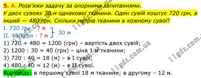 А. Розв'яжи задачу за опорними запитаннями. У двох сувоях 30 м однакової тканини. Один сувій коштує 720 грн, а інший — 480 грн. Скільки метрів тканини в кожному сувої? І. 720 грн - ? м ІІ. 480 грн - ? м 1) 720 + 480 = 1200 (грн) – вартість двох сувій; 2) 1200 : 30 = 40 (грн) – ціна 1 м тканини; 3) 720 : 40 = 18 (м) – в І сувої; 4) 480 : 40 = 12 (м) – в ІІ сувої. Відповідь: в першому сувої 18 м тканини; в другому – 12 м.
