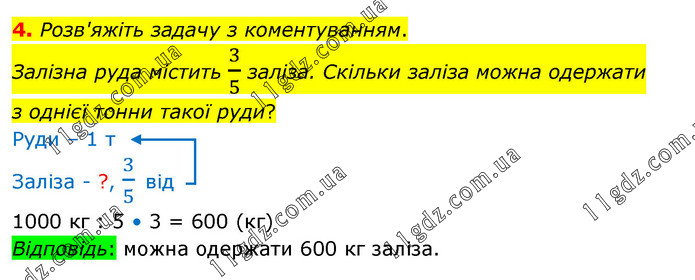 Розв'яжіть задачу з коментуванням. Залізна руда містить 3/5 заліза. Скільки заліза можна одержати з однієї тонни такої руди? Руди – 1 т Заліза - ?, 3/5 від 1000 кг : 5 • 3 = 600 (кг) Відповідь: можна одержати 600 кг заліза.