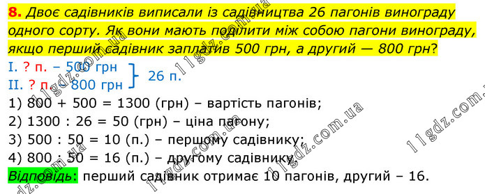 Двоє садівників виписали із садівництва 26 пагонів винограду одного сорту. Як вони мають поділити між собою пагони винограду, якщо перший садівник заплатив 500 грн, а другий — 800 грн? 1) 800 + 500 = 1300 (грн) – вартість пагонів; 2) 1300 : 26 = 50 (грн) – ціна пагону; 3) 500 : 50 = 10 (п.) – першому садівнику; 4) 800 : 50 = 16 (п.) – другому садівнику. Відповідь: перший садівник отримає 10 пагонів, другий – 16.